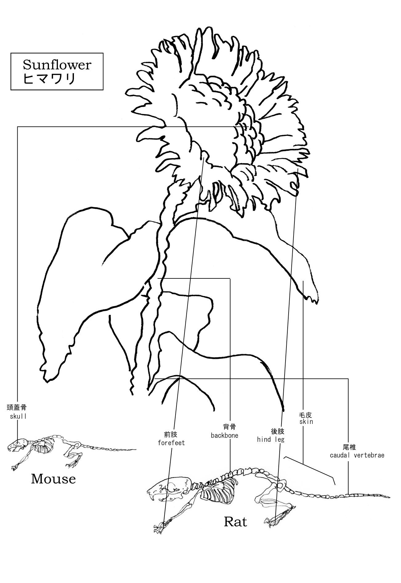 Lotus, Sunflower, Lycoris. If the piece of bone is too big, it becomes difficult to make a flower with it. So, I decided to use the bones of frozen mice that are sold in pet shops to feed reptiles and birds of prey. I dissected them and took out their bones. The rodents are bred and killed for pet food. To me, they seemed to symbolize how we humans treat nature in modern society.